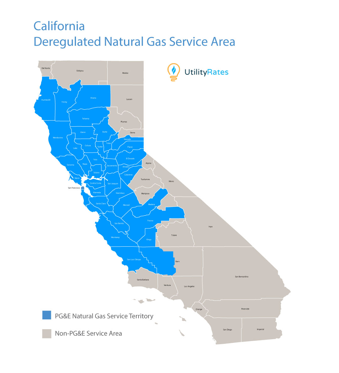 The PGE service area in California Deregulated - meaning you have choice and can shop for your natural gas provider. Enter your zip code to get started. Here's some quick things to understand about the California Gas Market
